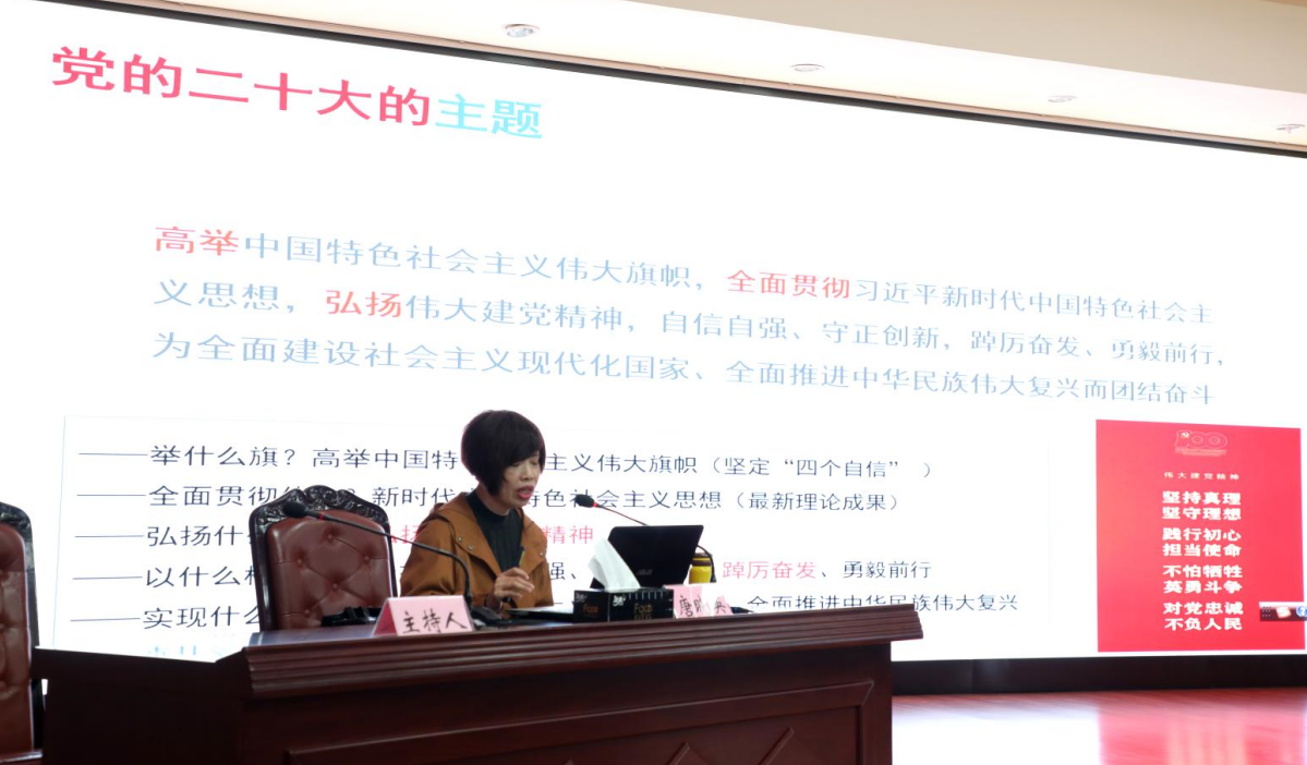唐曉英從深刻把握黨的二十大的主題和主要成果、深刻把握過去5年的工作和新時代10年的偉大變革、深刻把握開辟馬克思主義中國化時代化新境界的歷史責任、深刻把握以中國式現代化全面推進中華民族偉大復興的使命任務、深刻把握全面建設社會主義現代化國家的目標任務、深刻把握加強黨的全面領導和全面從嚴治黨的部署要求、深刻把握應對風險挑戰的重要要求、堅定推動黨的二十大決策部署在四川落地生根等方面,對黨的二十大精神進行了系統宣講和詳細闡述。